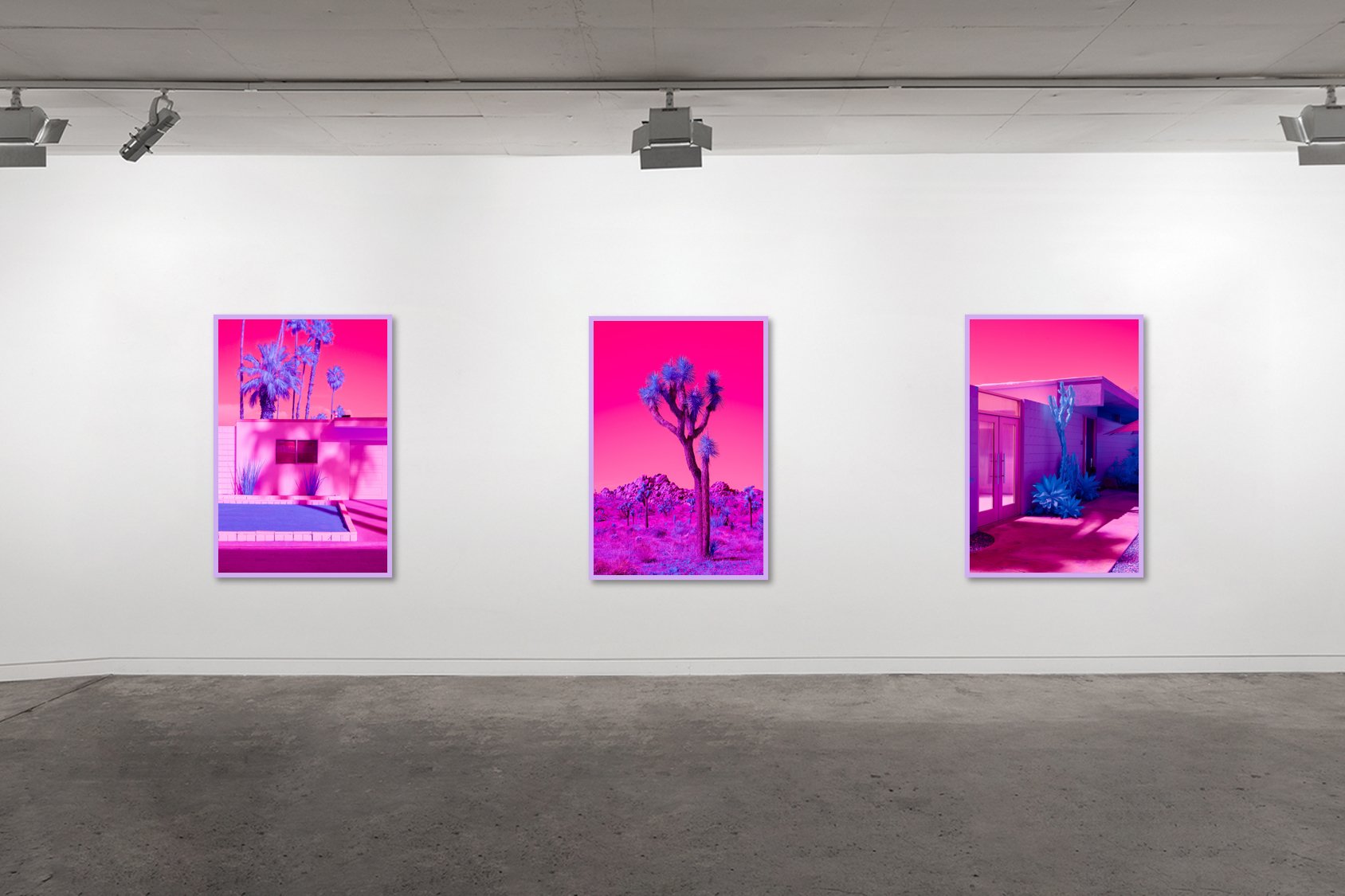 The infrared spectrum of light emanating from plants sits just beyond the light spectrum visible to the naked eye, and so in taking these photographs, I have been able to focus on and highlight the hidden things in nature that we, as humans, are not equipped to see, those that lie just outside of our physical perceptions. Here, healthy plants emit infrared light and take a certain colour through the process, and so I began to view these sometimes barren landscapes as a lush oasis where succulents and palm trees thrive and synthetic grass can be identified through the viewfinder. It’s fascinating to me that, in person, these landscapes can sometimes appear muted and dead, but in this light, we see shrubs and cacti that are glowing brighter than anything else in the scene; what appears to the eye as dusty brown is in fact a glowing world of its own. It’s a search for life and colour in places you do not expect it to exist.